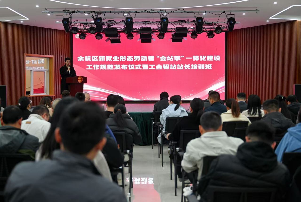 11月26日,浙江省杭州市余杭区新就业形态劳动者“会站家”一体化建设工作规范发布仪式暨工会驿站站长培训班在瓶窑工人文化宫举行。来自全区各镇街(平台)总工会、行业工会负责人及工会驿站站长等百余人参加活动,共同探索工会驿站服务转型升级的新路径。