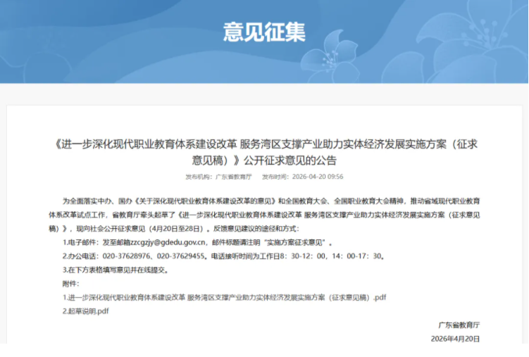 近日,广东省教育厅牵头起草了《进一步深化现代职业教育体系建设改革 服务湾区支撑产业助力实体经济发展实施方案(征求意见稿)》(以下简称《征求意见稿》)。